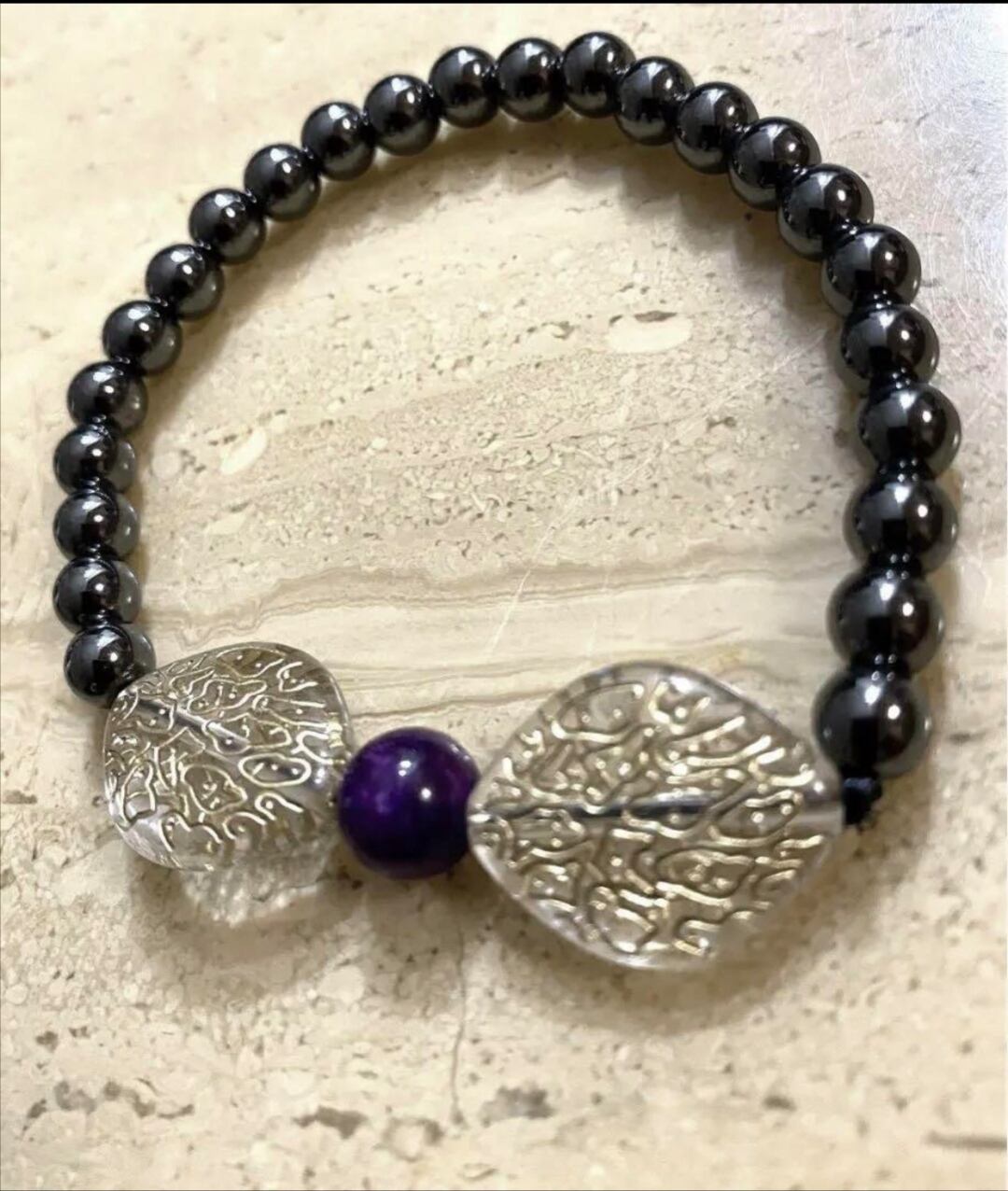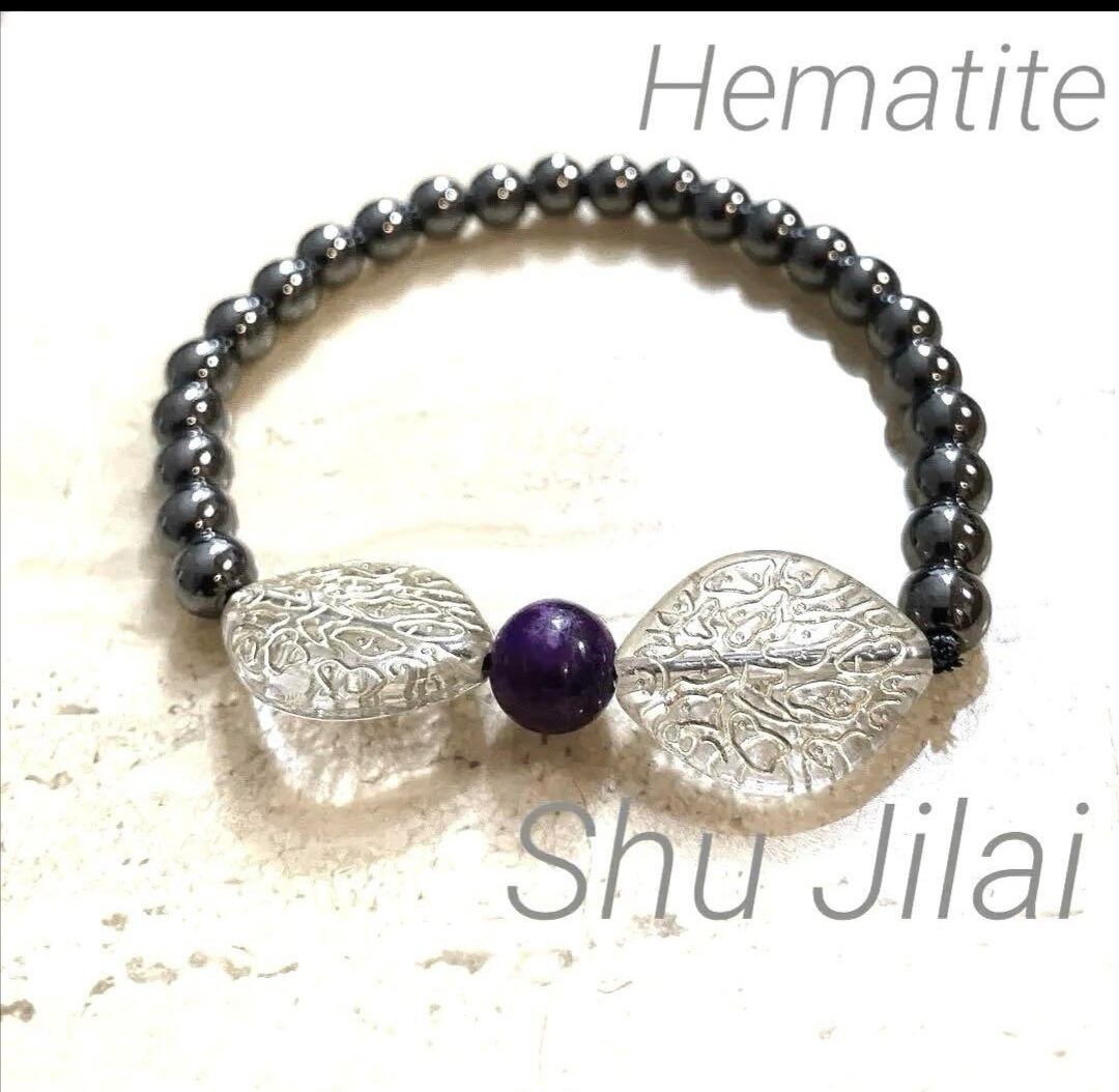 光沢ヘマタイト6ミリ玉と天然のスギライトを使用し、オペロンゴムで制作しました。